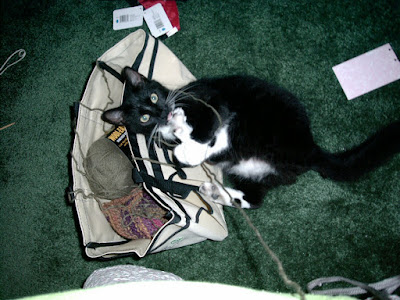 And, another gratuitous kitten shot--I yelled at her for chewing the yarn, so she's moved on to finished items: